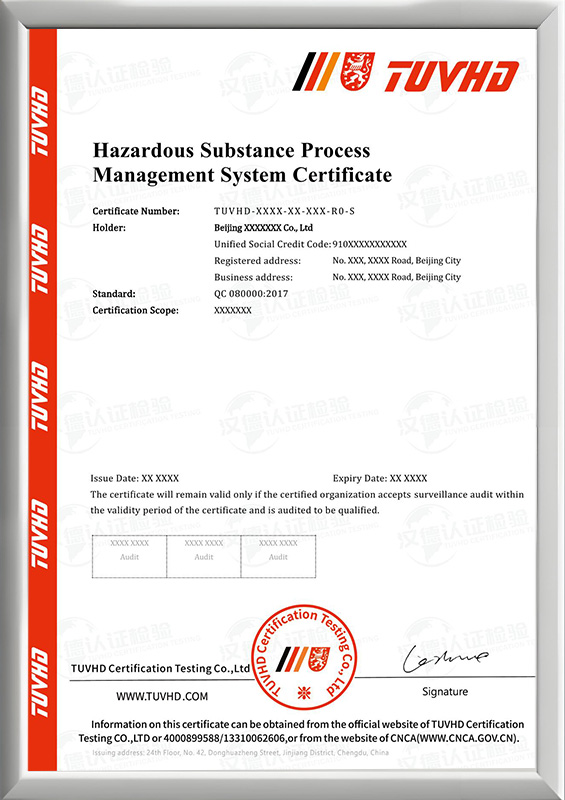 The QC080000 Hazardous Substance Management System (Toxic and Hazardous Substance Management System for Electrical and Electronic Components) is an international certification system specifically designed to manage hazardous substances in electronic and electrical products. It is developed by the China Electronics Industry Standardization Technology Association to help enterprises effectively manage and control harmful substances in products, ensuring that products comply with relevant international and domestic standards and laws and regulations throughout their entire lifecycle. The background of this system stems from the concern for environmental protection and human health, especially in the process of electronic waste treatment and electronic product production, to reduce the use and emission of harmful substances and minimize potential harm to the environment and human health.